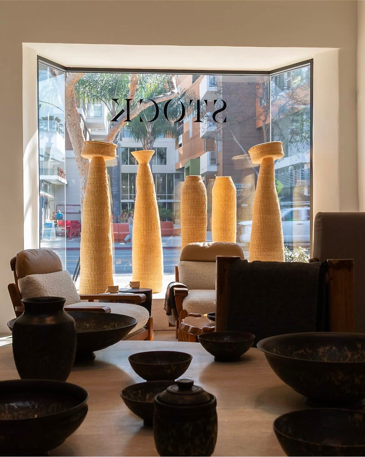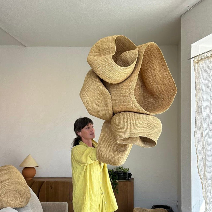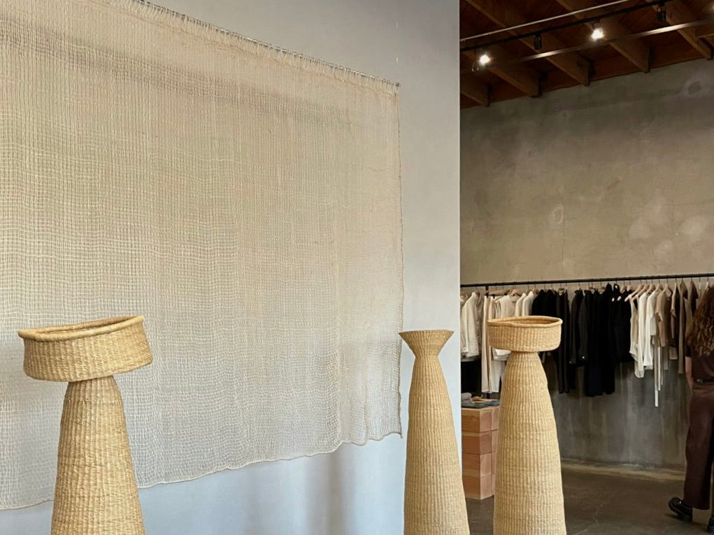 We think about our installations as visual, tactile conversations between material and space, weaver and audience, traditional and contemporary. We consider how light hits a woven surface and throws shadow patterns at different times of day, how the rough texture of hand-thrown pottery contrasts with smooth concrete walls, how the scale of a piece changes the entire rhythm of a room.