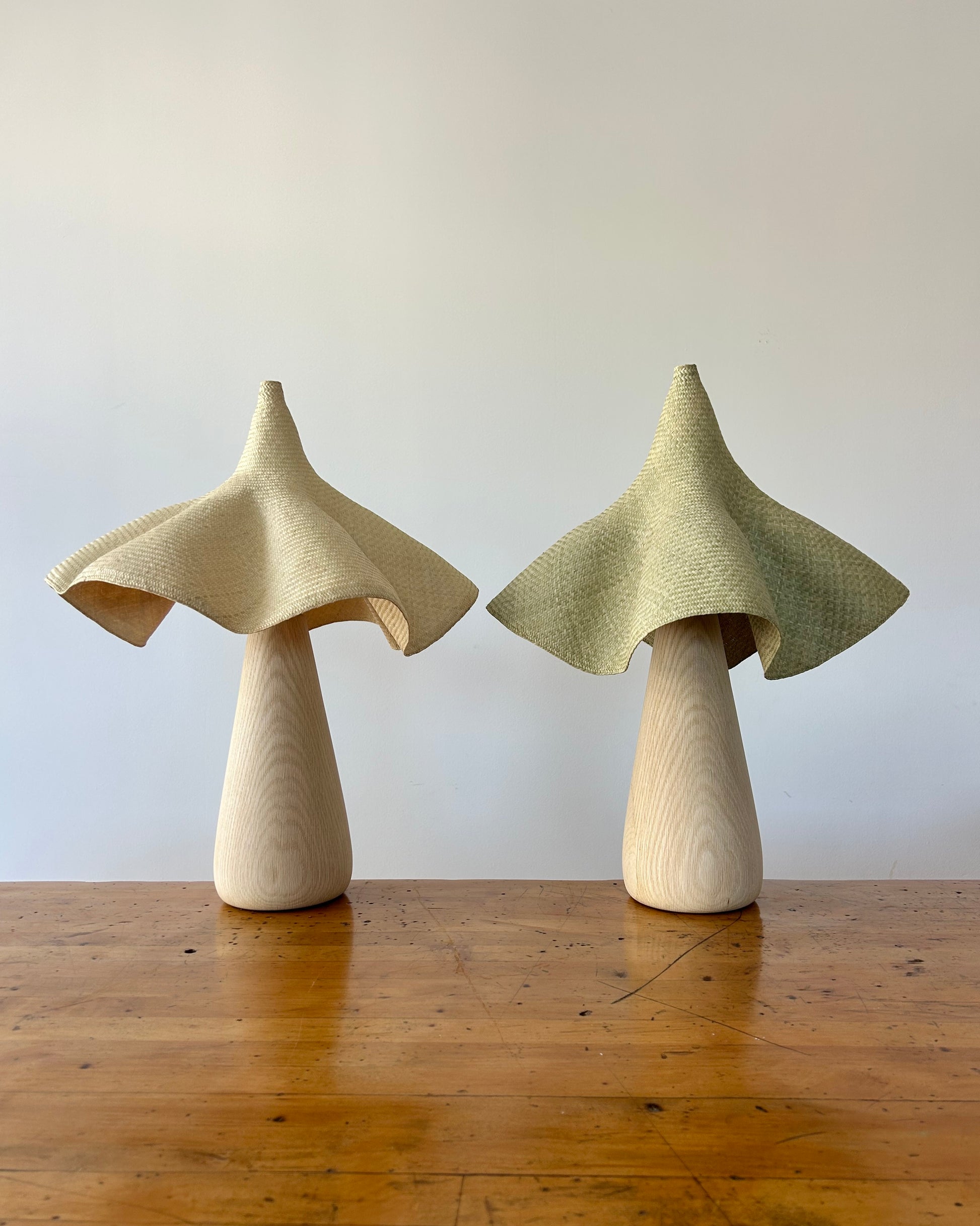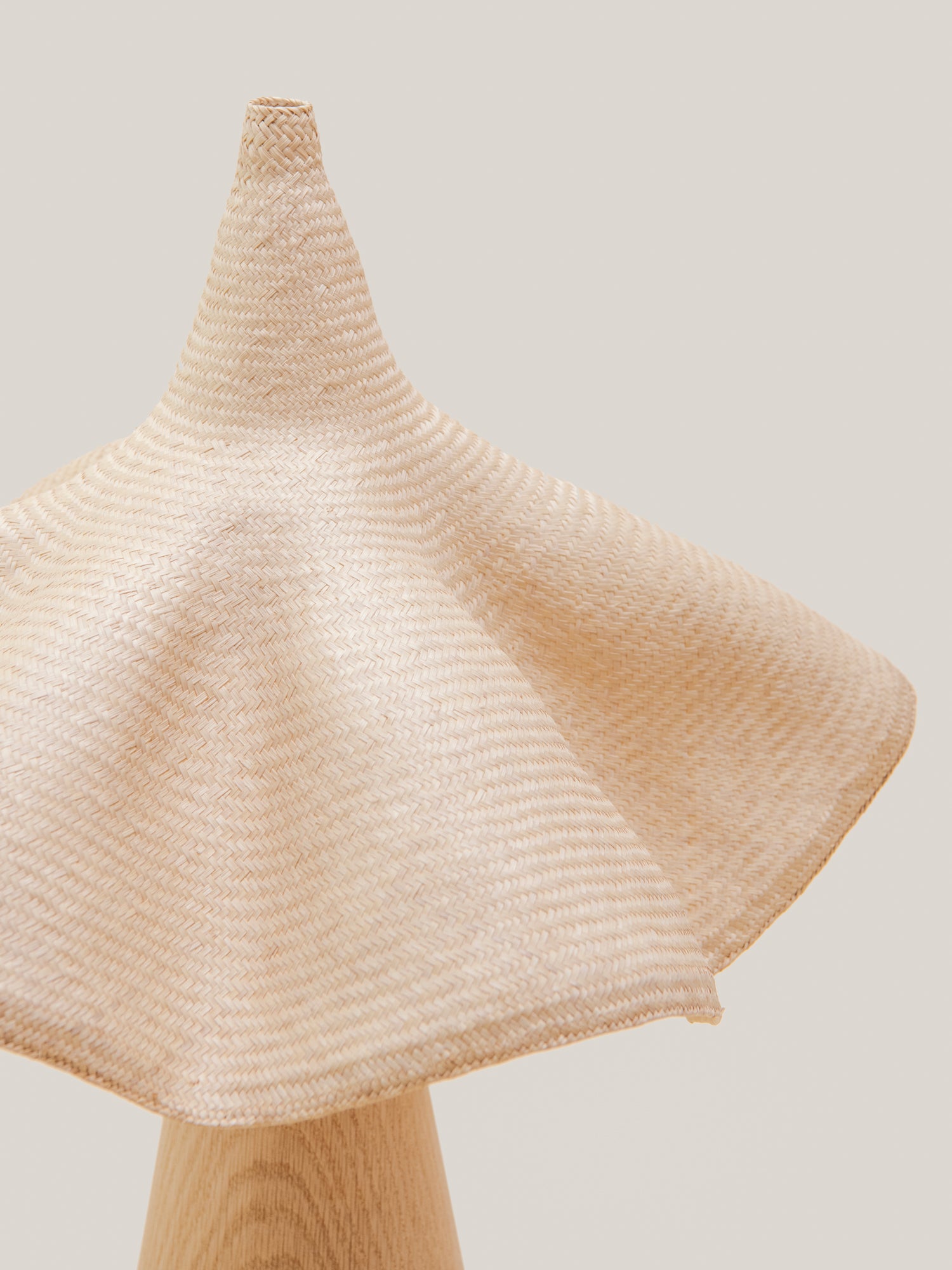 A stunning table lamp featuring a solid oak base with sculptural handwoven palm shade. The Posie lamp was inspired by the Angel's Trumpet flower, and emulates its flared undulating form.